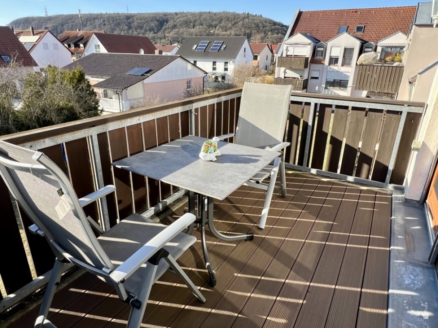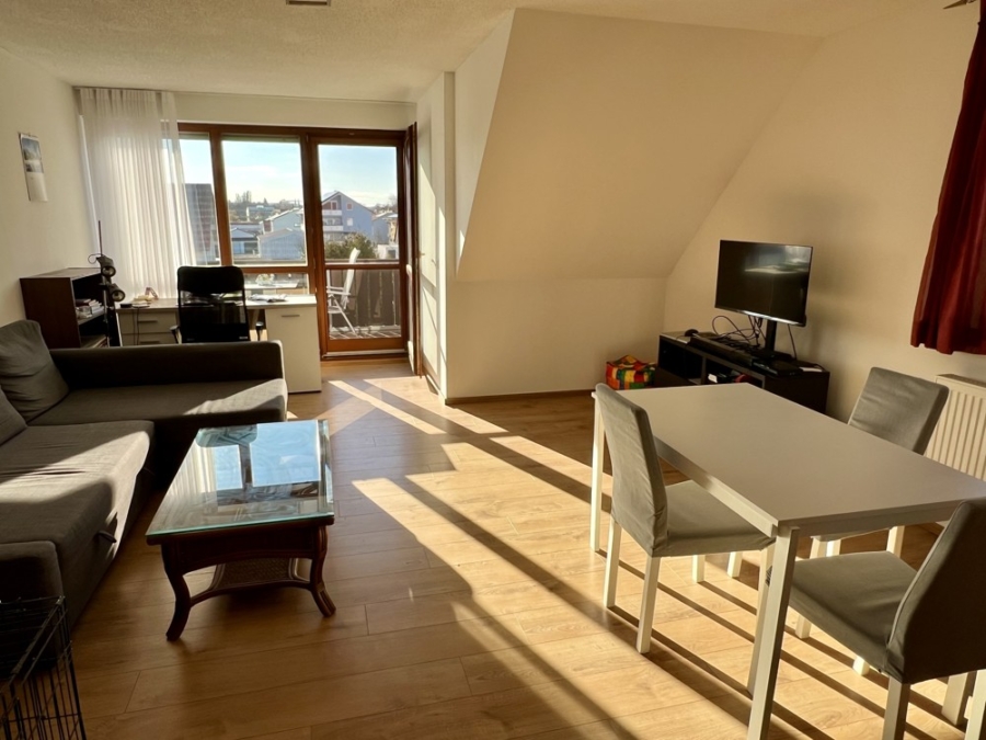 Die Wohnung ist aufgeteilt in ein großes Wohn/Esszimmer mit Zugang zum Balkon mit schönem Weitblick, ein Abstellraum, ein Schlafzimmer, ein Badezimmer mit Badewanne und Dusche sowie ein Waschmaschinenanschluss.