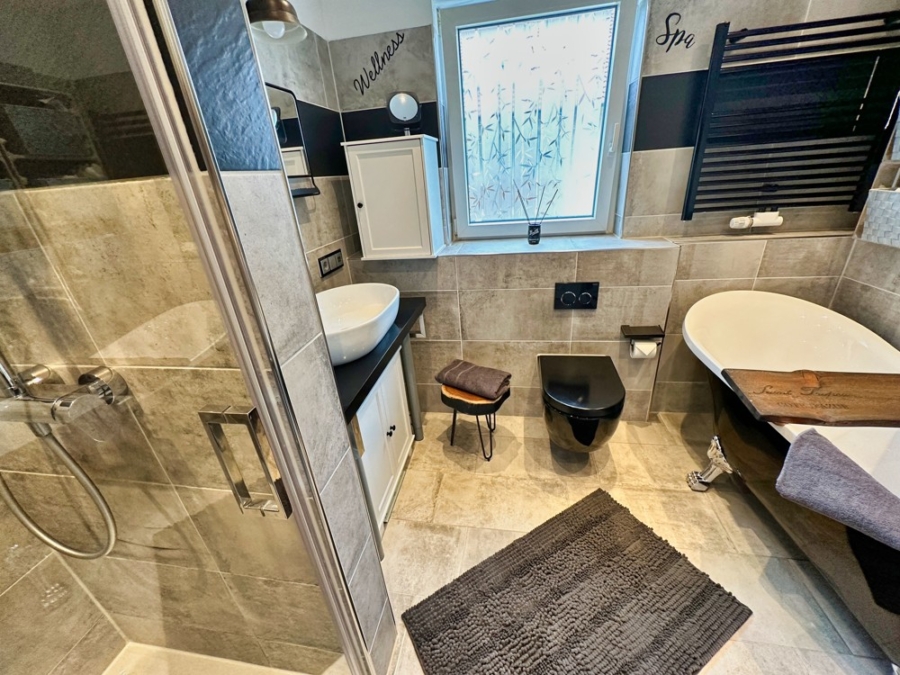 In Ihrem Badezimmer erwartet Sie eine freistehende Badewanne sowie eine begehbare Dusche.