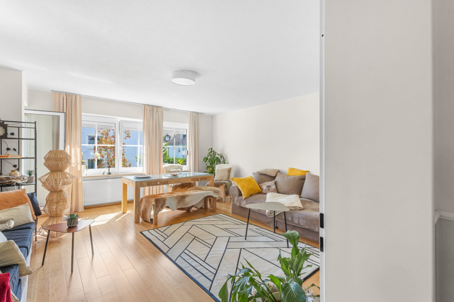 Der großflächige, gut geschnittene Wohnbereich ist das Herzstück der Wohnung. Hier können Sie gemütliche Abende verbringen, während die Sonnenstrahlen durch die großen Fenster den Raum in ein warmes Licht tauchen. Zudem bietet Ihnen das Wohnzimmer einen separaten Zugang zum Süd-Balkon.