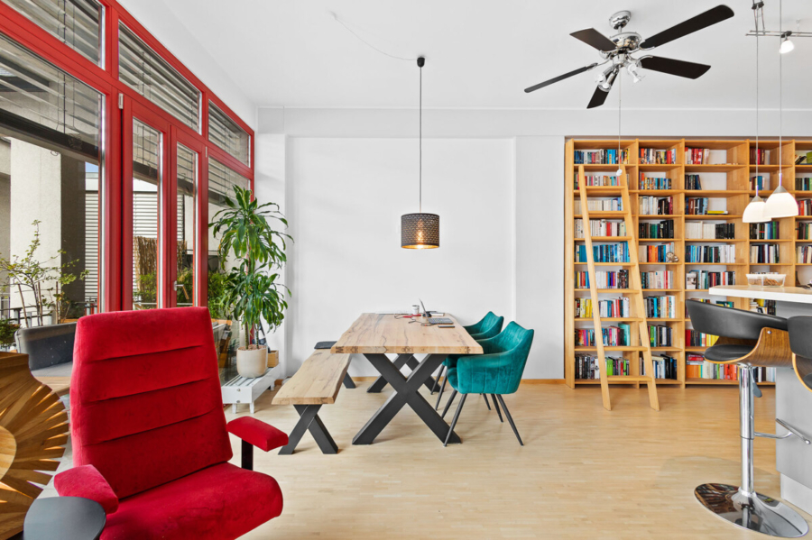 Durch die Fensterfront zum Innenhof wird der gesamte Wohnbereich ins rechte Licht gesetzt. Vorgelagert der große Balkon, der im Sommer zum entspannen einlädt.
