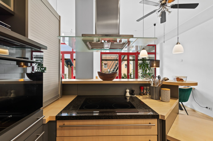 Das Zentrum im Wohnbereich bildet die exklusive gut ausgestattete Einbauküche mit Frühstückstheke.