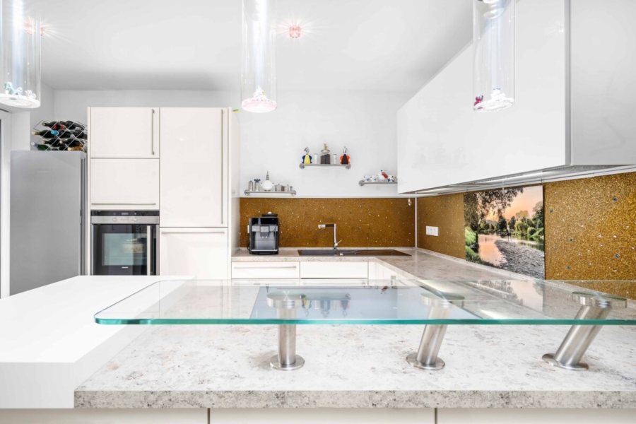 Die offene, hochwertige Einbauküche fügt sich nahtlos in das Wohnkonzept ein und erfüllt höchste Ansprüche. Zwei stilvolle Zimmer bieten vielfältige Nutzungsmöglichkeiten – ob als Schlafzimmer, Homeoffice oder Gästezimmer.