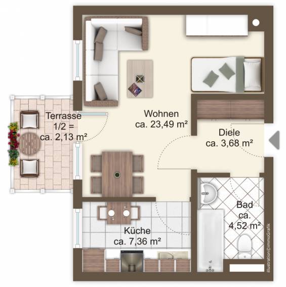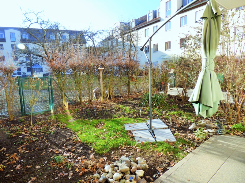 Geradewegs gelangen Sie in Ihren großzügig dimensionierten Wohnbereich - mit nischenhaftem Schlafbereich - der Sie zum einen über Ihre nach Süden ausgerichtete Terrasse in Ihren kleinen Garten führt.