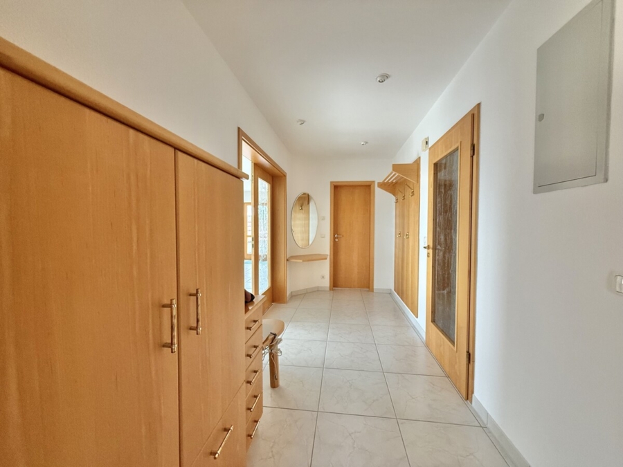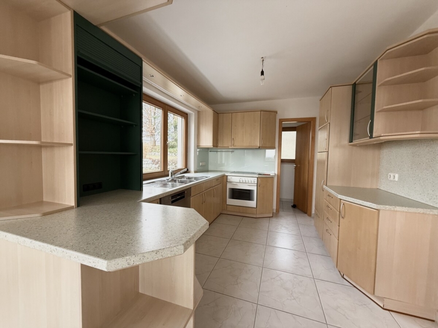 Die angrenzende Wohnküche ist mit einer großen, gepflegten Einbauküche ausgestattet und bietet zusätzlich Platz für einen Essbereich. Besonders praktisch ist die direkt angeschlossene Speisekammer, die zusätzlichen Stauraum für Vorräte und Haushaltsgeräte schafft.