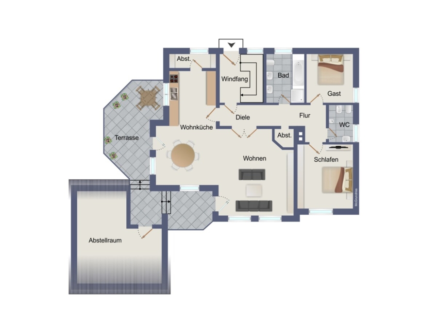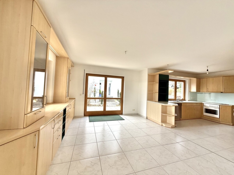 Von der Wohnküche aus gelangt man direkt auf die Terrasse, die den Wohnraum ideal erweitert und zu entspannten Stunden im Freien einlädt.