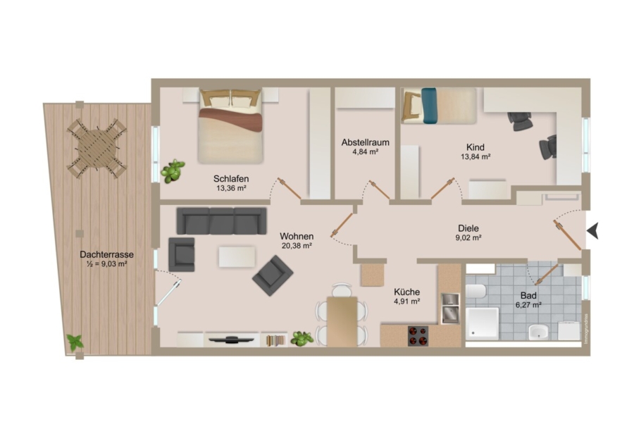 Wohnen/ Essen/ Kochen offen gestaltet, (EBK inclusive), Schlafzimmer, Zimmer, Bad mit Dusche, überdachte Dachterrasse, Abstellraum.
