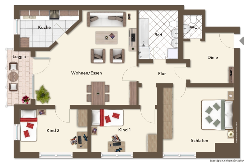 Geradewegs gelangen Sie in Ihre Diele, die Ihnen wiederum rechter Hand Ihr Badezimmer bietet. Linker Hand zunächst Ihr Schlafzimmer, folgend Ihr eines Kinder-, Arbeits- oder Gästezimmer.