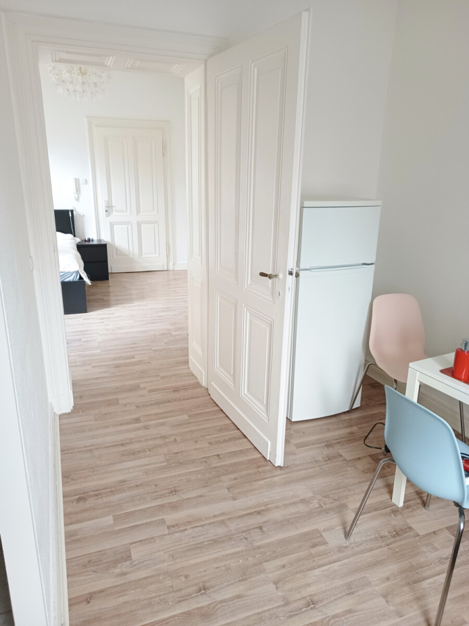 In Ihren Wohnräumen finden Sie Laminat, in Ihrem Badezimmer helle Fliesen vor.