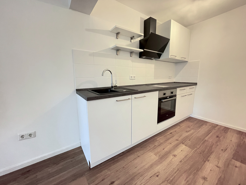 Ihr Appartement verfügt über eine in Ihren Wohn- und Schlafbereich integrierte kleine Einbauküche in weißen Fronten – und zeigt sich Ihnen mit allen notwendigen Elektrogeräten ausgestattet.