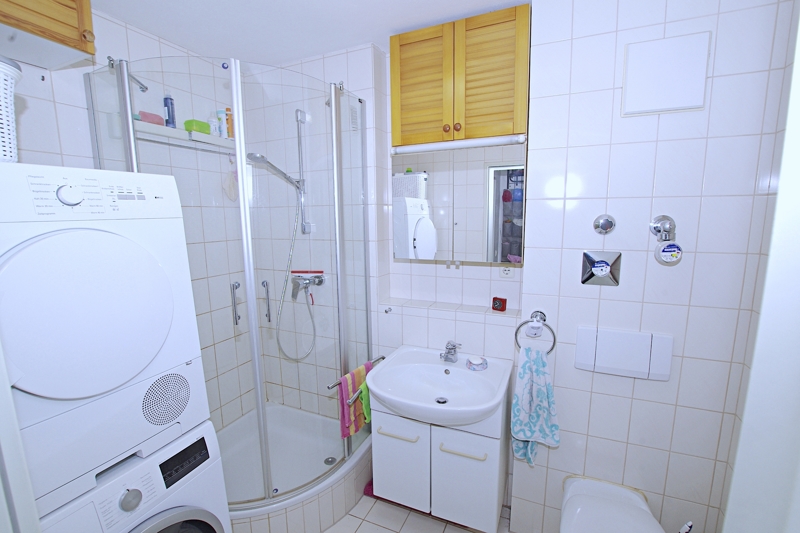 Das geräumig Badezimmer bietet eine Dusche, ein Waschbecken, ein WC sowie einen Waschmaschinenanschluss.