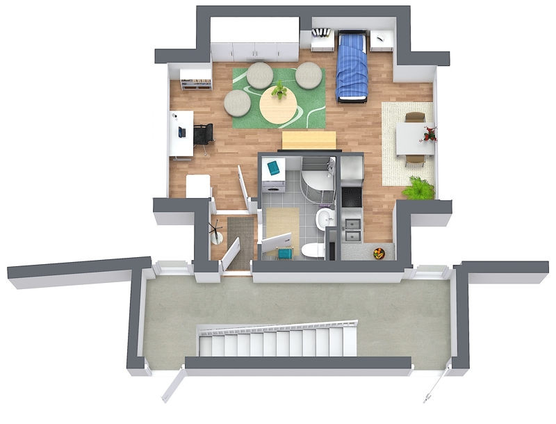 Der Wohnbereich bietet ausreichend Platz für eine gemütliche Sitzecke, ein Bett, einen Arbeitsplatz am Fenster, sowie einen Essbereich.