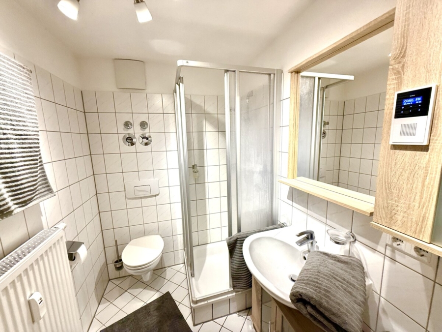 Ihr Badezimmer – bodenseits wie raumhoch weiß gefliest – verfügt über eine Dusche, über die Anschlüsse für Ihre Waschmaschine und schon über Badmöbel.