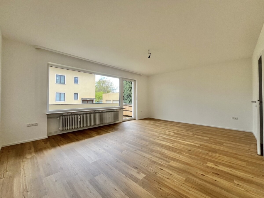 Das großzügige Wohnzimmer mit Zugang zum Balkon und seiner beeindruckenden Fensterfront lässt viel Tageslicht herein und schafft eine warme, offene Atmosphäre, in der das Familienleben seinen Mittelpunkt findet. Der Balkon mit Blick auf den Garten lädt zu entspannten Momenten im Freien ein und erweitert den Wohnraum auf angenehme Weise.