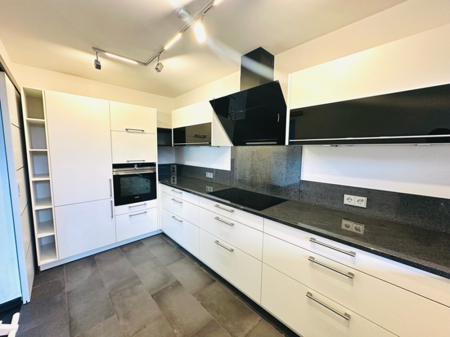 Direkt angrenzend und durch eine Schiebetür getrennt, liegt die moderne und großzügige Küche mit hochwertigen Elektrogeräten.